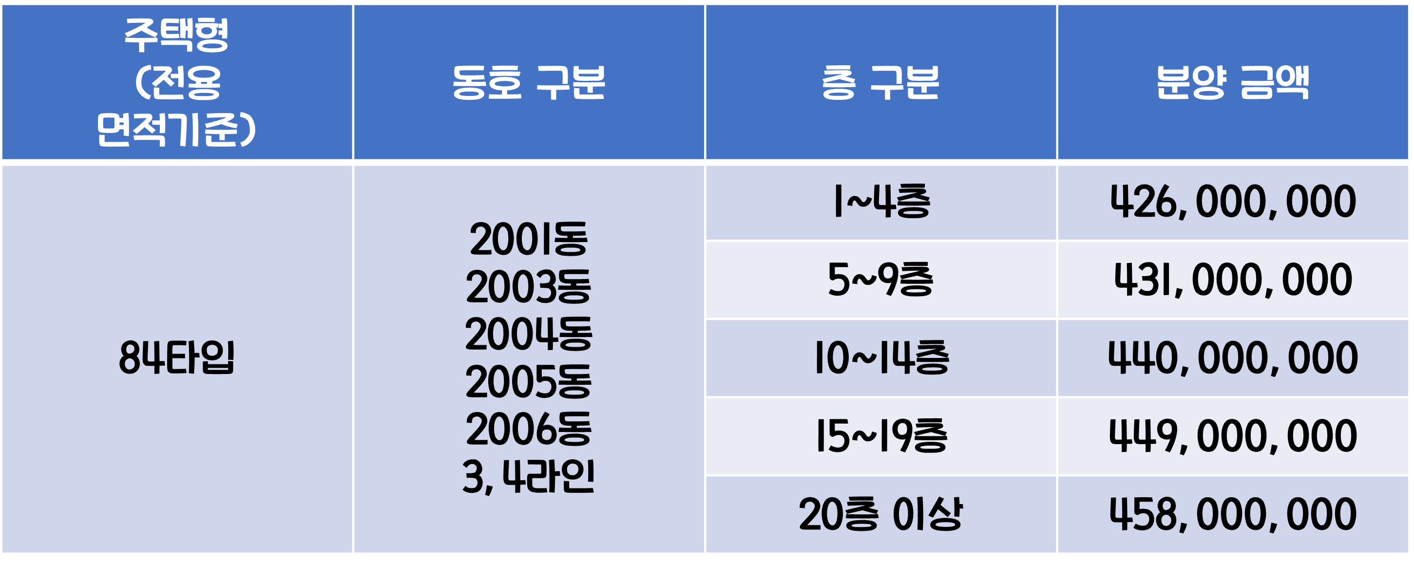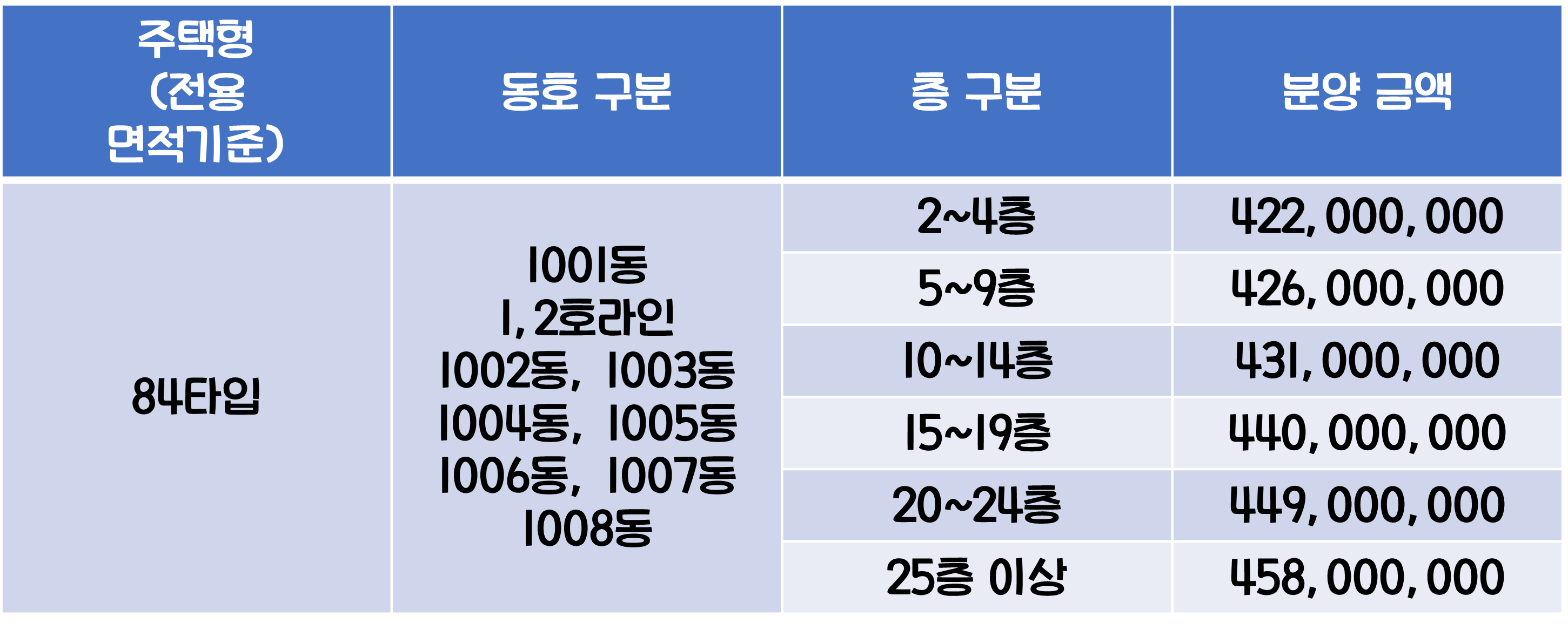 1순위 청약에서 당첨자를 선정하는 방식은 전용 59㎡, 65㎡, 84㎡의 경우 가점제 40%와 추첨제 60%가 적용이 되며 전용 105㎡는 추첨제 100%가 적용되는데요, 만약 1순위 청약 미달로 인하여 2순위 청약을 진행할 경우 추첨제 100%가 적용되고 2순위 청약에는 예치금에 관계없이 청약통장 가입자면 청약이 가능합니다.