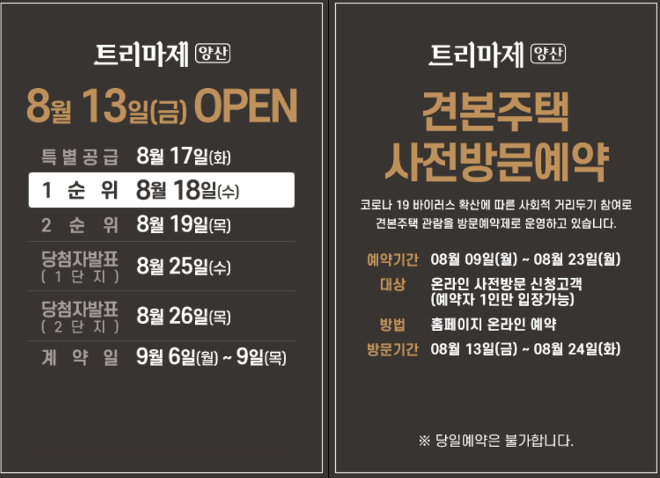 오늘은 양산 덕계 트리마제 분양 및 청약 정보에 대해 알아보았습니다. 모델하우스를 통하여 실제 내부를 살펴보실 수 있고 현재 코로나 19로 인하여 당일 방문 예약은 불가하고, 홈페이지를 통하여 미리 예약 후 방문이 가능하다고 하니 이 점 참고하시면 좋을 것 같습니다. 모두 오늘도 좋은 하루 보내시길 바랍니다. 감사합니다.