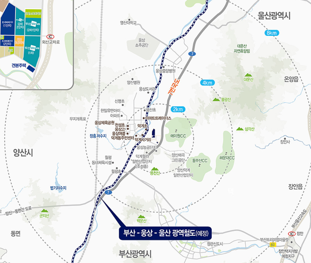 게다가 주변에 위치한 이마트 트레이더스, 롯데마트, 덕계우체국 등 병원·은행·관공서 등 풍부한 생활 인프라를 누릴 수 있고, 천성산, 불광산, 용천산, 덕산 공원을 가까이에서 누릴 수 있으며, 웅상 체육공원과 덕계 스포츠파크를 비롯해 웅상 센트럴파크가 예정되어 있는 것이 특징입니다.